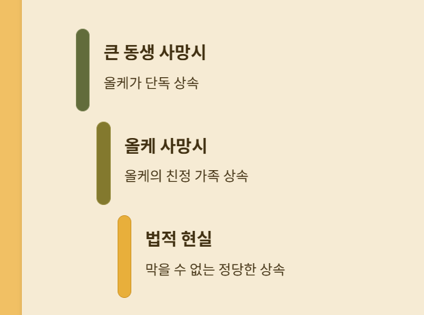 자녀가 없는 큰 동생의 상속 문제는 마음이 좀 불편하시더라도 법적으로 피할 수 없는 현실입니다. 큰 동생이 재산을 상속받은 뒤 만약 올케보다 먼저 사망하면 올케가 단독 상속인이 돼서 그 재산을 모두 상속받게 되고, 이후 올케가 사망하면 올케의 법정 상속인인 친정 가족에게 상속됩니다.