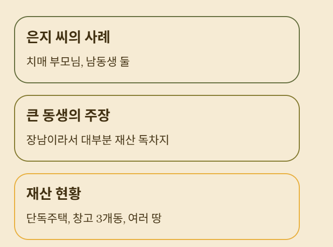 이러한 상황은 많은 가정에서 겪는 전형적인 상속 분쟁 사례입니다. 큰 동생이 장남이라는 이유로 대부분의 재산을 독차지하려는 모습을 보이고 있습니다.