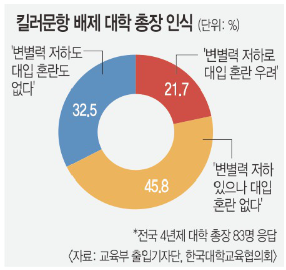 다른 서울 지역 사립대 입학처장은 "수능은 N수생 비율도 높고 학원에서 문제 푸는 방법을 익히면 점수가 오르는 시험"이라며 "그런 학생들이 들어와서 학업 성취도가 낮으면 수능에 대해 상당히 의문을 갖게 되는데 그런 인식이 늘어났다"라고 전했습니다.