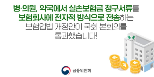 그러나 이번에 병 의원, 약국에서 실손의료보험금 청구서류를 보험회사에 전자적 방식으로 전송하는 보험업 법 개정안이 국회 본회의를 통과했습니다!