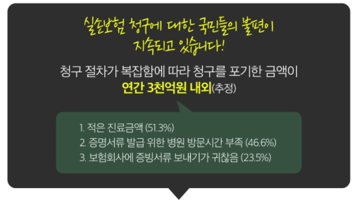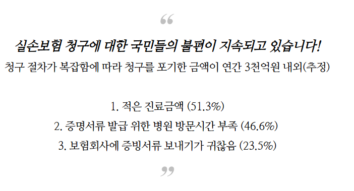 실손의료보험은 "실제 부담한 의료비만 보상하는 보험"으로서, 약 4,000만 명('22년 말)이 가입하여 연간 1억 건 이상의 보험금 청구가 발생 중이나, 일일이 서류를 발급받아 서면으로 제출하여야 하는 등 청구 절차가 복잡함에 따라 청구를 포기한 금액이 연간 3천억 원 내외(추정)에 달하는 등, 국민들의 불편이 지속되고 있습니다.