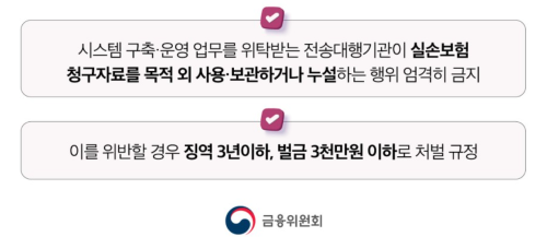 시스템 구축 운영 업무를 위탁받는 전송대행기관이 실손보험 청구자료를 목적 외 사용 보관하거나 누설하는 행위 엄격히 금지 이를 위반할 경우 징역 3년 이하, 벌금 3천만 원 이하로 처벌 규정도 만들어 두었어요.