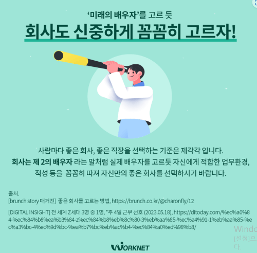 회사를 선택하는 것은 자신의 '미래의 배우자'를 고르는 것과 같이 신중해야 합니다. 적합한 업무 환경, 적성 등을 꼼꼼히 따져 자신만의 좋은 회사를 선택하시기 바랍니다"
