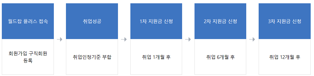 월드잡플러스(www.worldjob.or.kr) 접속(회원가입, 구직회원 등록) ▶▶ 취업 성공(취업인정기준 부합) ▶▶ 1차 지원금 신청(취업 1개월 후) ▶▶ 2차 지원금 신청(취업 6개월 후) ▶▶ 3차 지원금 신청(취업 12개월 후)